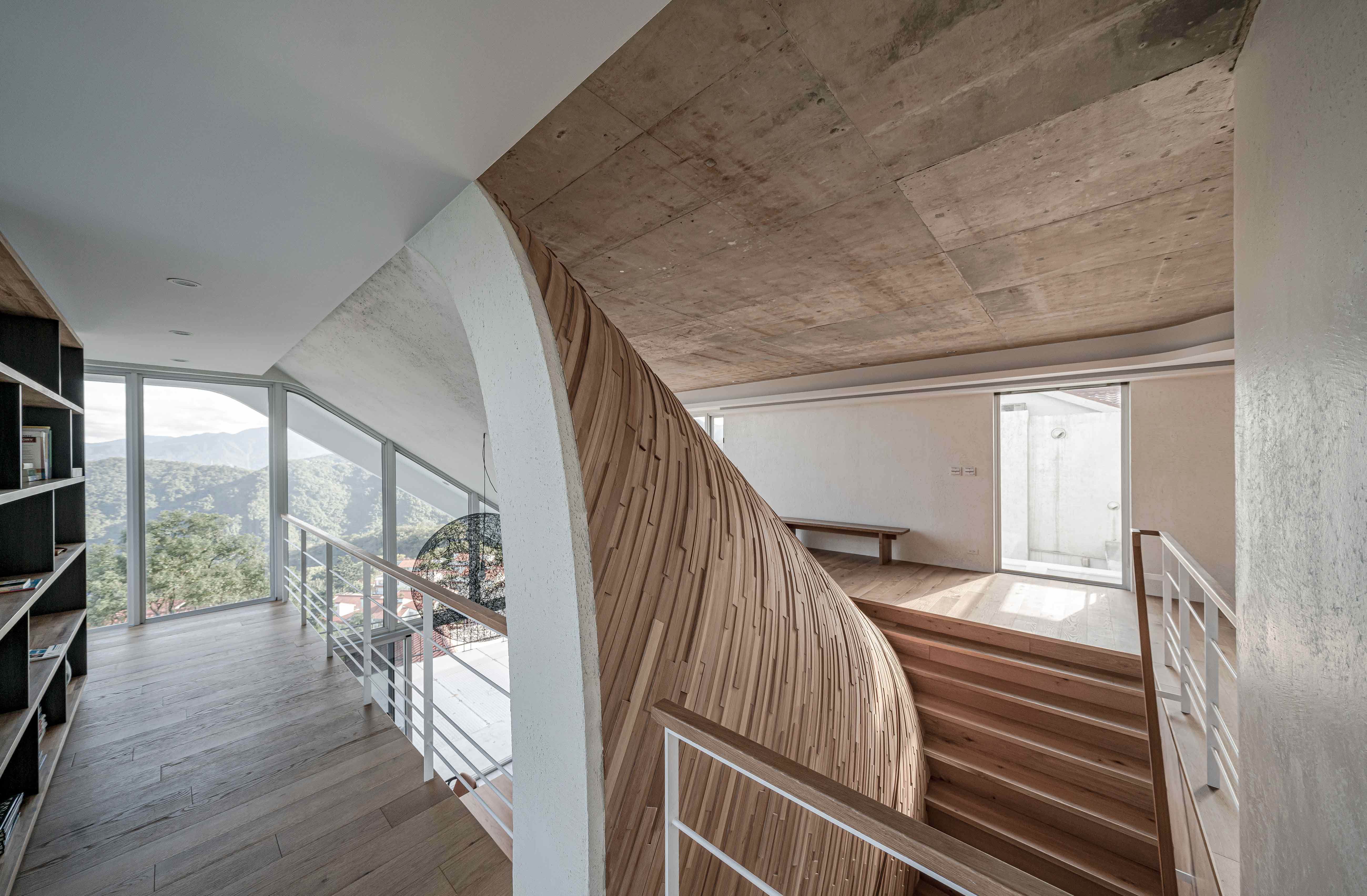中間層是完全開放的交誼空間,提供居住者使用上最大的自由度。生活的空間與場域緊密的延伸並銜接著窗外的自然。空間順著一片優雅而柔軟的曲牆,垂直蜿蜒往樓下的起居空間以及蔓延到樓上的臥房空間,呼應著窗外山景的室內地景,是生活的動線,也是建築的結構。它重新界定著室內的垂直關係,是空間的介面也是收藏自然光景變化的容器。透過映射山巒間最美的山嵐起伏以及變幻無窮的光影色澤,在室內創造隨時間變色的生活場景。