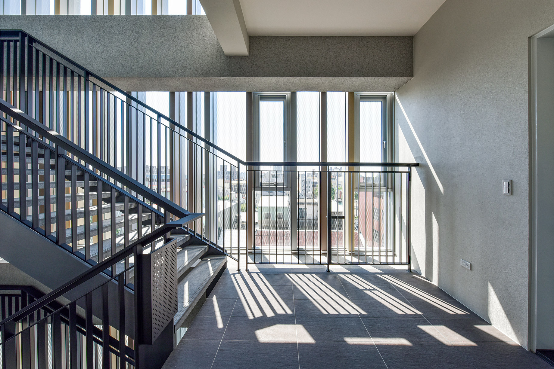 我們翻轉了傳統的平面布局,將建築物分成前後兩段,把電梯、樓梯以及廁所等服務性空間放置在前段面向街道的前庭(中庭)區域,讓主堂空間完整地在後段呈現,這樣主堂就沒有附屬機能空間的干擾,可以完整地擁有基地的整個面寬。主樓梯在入口前庭的一側引領人們直達二樓的主堂,二樓以上主樓梯被置於騎樓上方,成為直達頂層的鋼構樓梯,隔著有金屬隔柵的大面玻璃與大街對話,教會的正面不再是傳統的中軸對稱美學,而是有著彩色遮陽板的主樓梯,讓教會活動時人潮的上下流動成為街道表情的一部分。