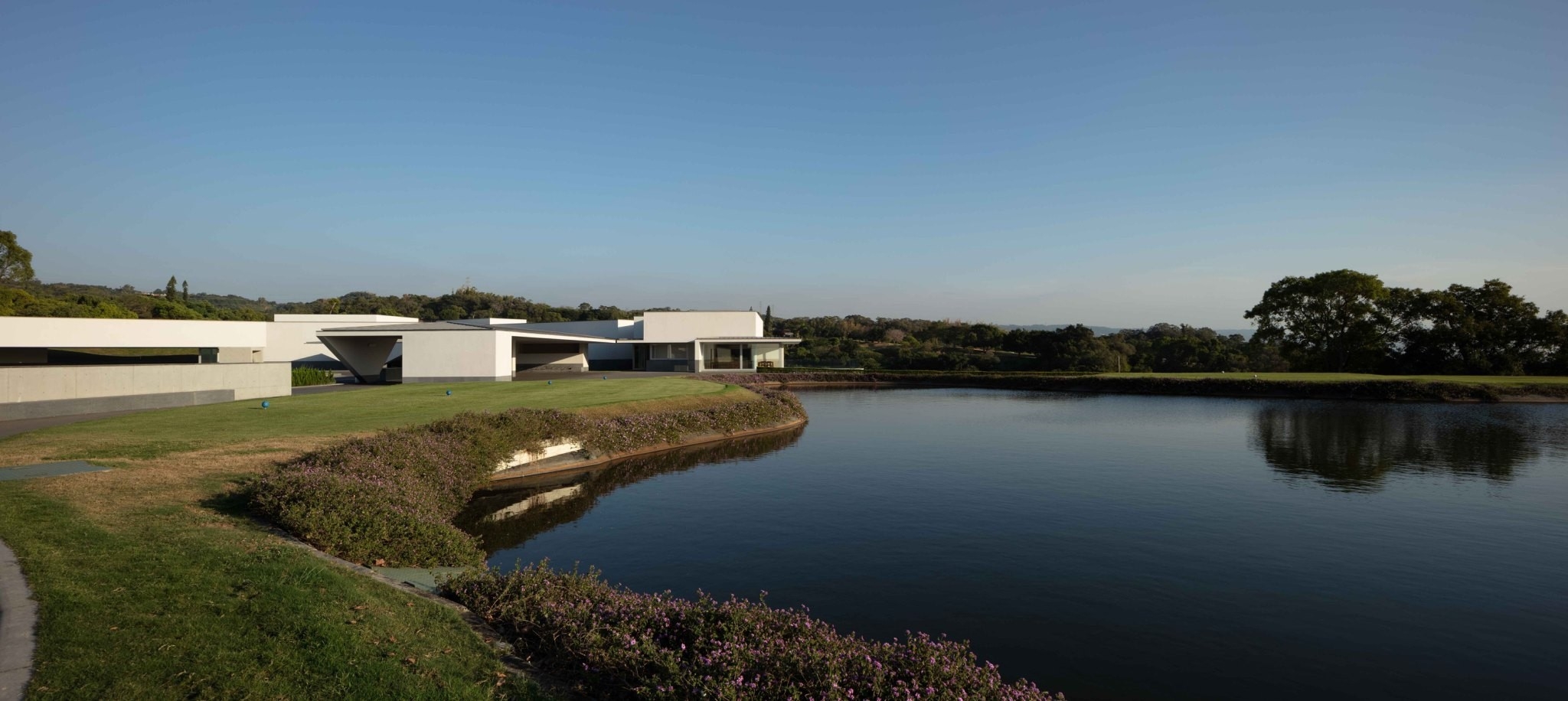 動線規劃是持續成長的台豐高爾夫俱樂部最艱鉅挑戰之一,主要來自使用者參數的複雜程度與日俱增。隨著球場不再僅以滿足運動需求為目標,未來俱樂部將視野拓展至更高層次的藝術表現與生活美學,如此一來,場館營運就必須同時妥善安排會員、球友、超跑車主、一般民眾等不同群體的空間動線。如今映入眼簾、看似分散的空間量體雖然各司其職,但實際上多半共用基礎結構與基盤設施,將動線極大化之情況下所產生動輒百米以上的連續牆面,除了採光稍弱處乍現天窗的神來一筆,西薩大師大幅度設置水平落地窗增加開口面積,藉由複合式節能玻璃將球場綠意盎然的景緻由外向內引導之外,更別出心裁地挑選了不同於西薩會所的灰色混凝土,透過精準、到位的材料控制,讓弱化壓迫感的白色混凝土為嘉卿會所披上大自然的畫布,渾厚牆體轉化似重若輕,隨時間更迭產生不同的光影韻律,水池樹影搖曳其上更是增添空間詩意。