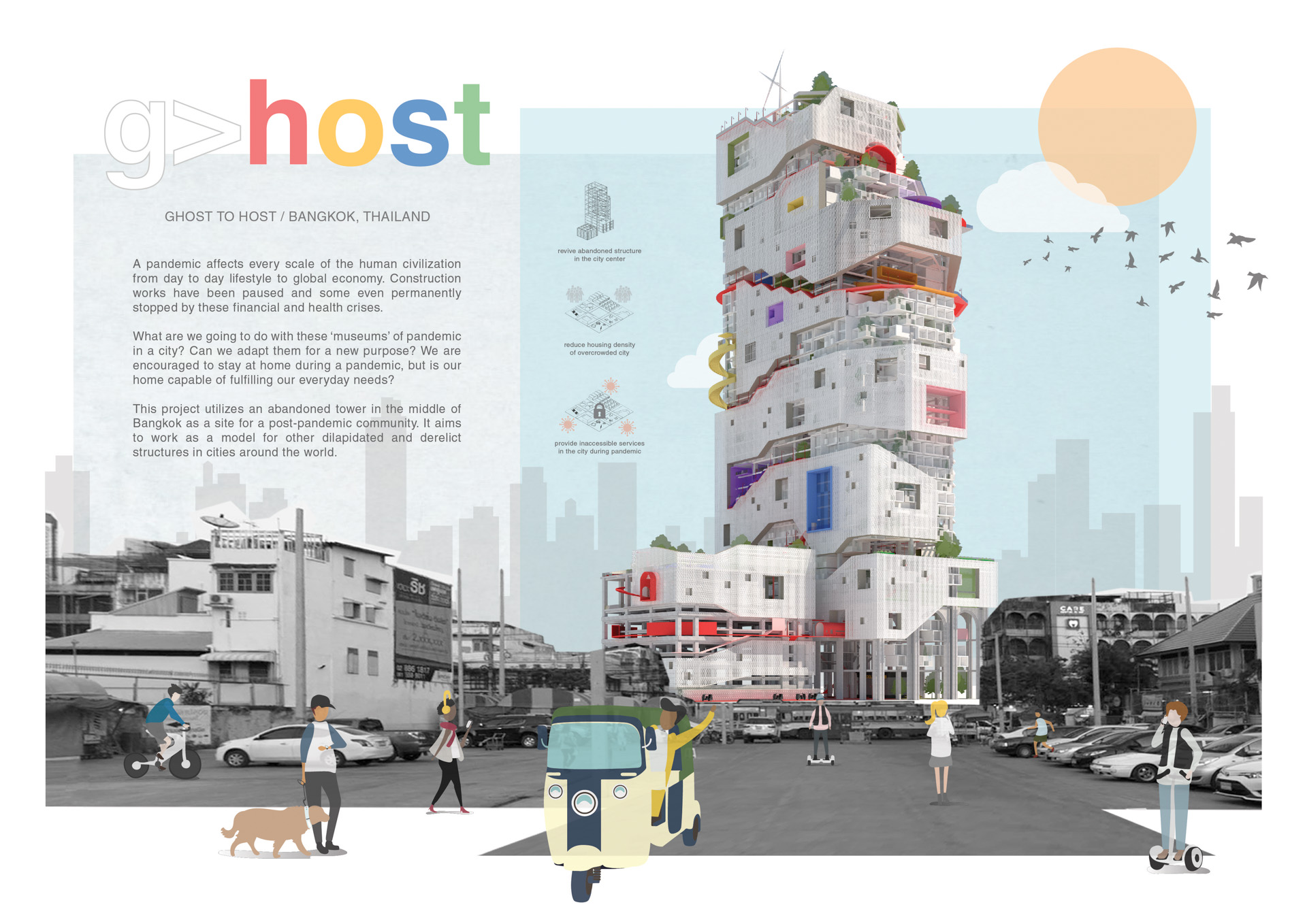 首獎(獎金2,500)由來自泰國Puangniyom Pongpol與馬來西亞Mah Yi Jun所設計的作品「Ghost to Host」贏得,兩人將曼谷著名的爛尾樓Sathornue Unique Tower 重新改造為新的經濟住宅和自給自足的社區,提供給中下階級住民舒適的居住環境。Francine認為以既有的廢棄建物作為設計發想,是一個很好的出發點。以環繞大樓盤旋而上的主動線作為街景,呈現獨特的建築外觀。本案不僅是單純的集合住宅,更可視為垂直化的現代聚落,其滿足了現代人日常所需的各個面向。