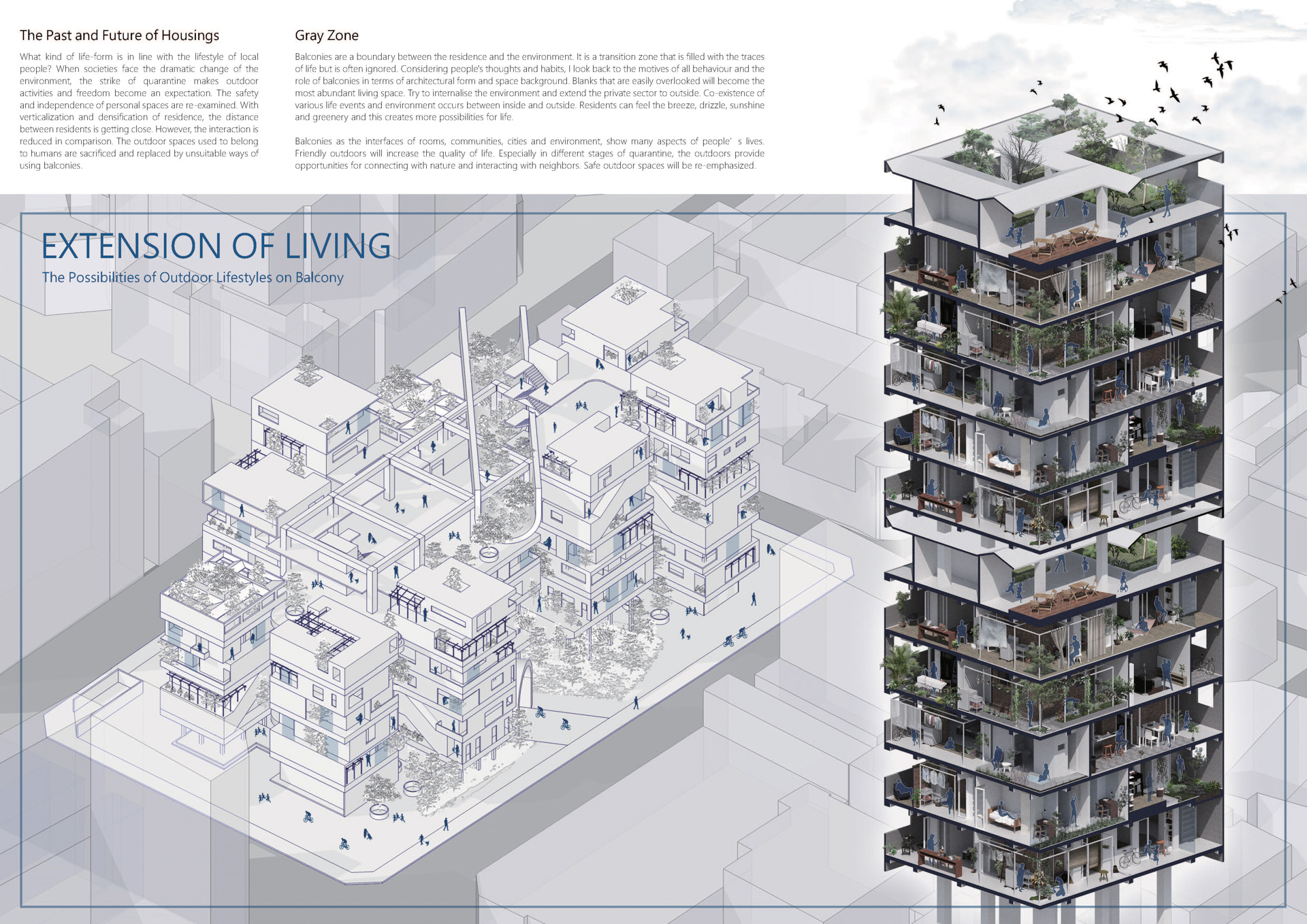 第二名(獎金2,000)由來自台灣的黃子哲以「Extension of Living」贏得,獲得,重新思考室內跟室外的界線,透過改造不同尺度的內外邊界,創造出能因應不同隔離程度的社區,在面對疫情的影響與外出的限制時,居住者仍能享受完整、有品質的生活。Francine指出公私領域邊界的定義,一直是有趣的挑戰。在此案中,黃子哲將陽台作為關鍵的建築構件,藉以定位室內戶外,公眾與私人領域的過渡,並同時兼顧陽台本身作為一場所的空間品質。