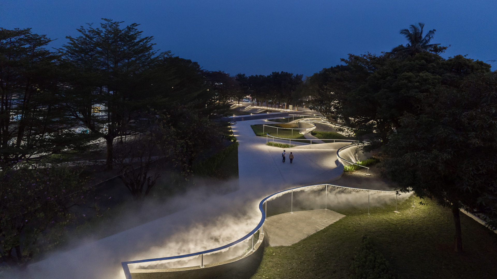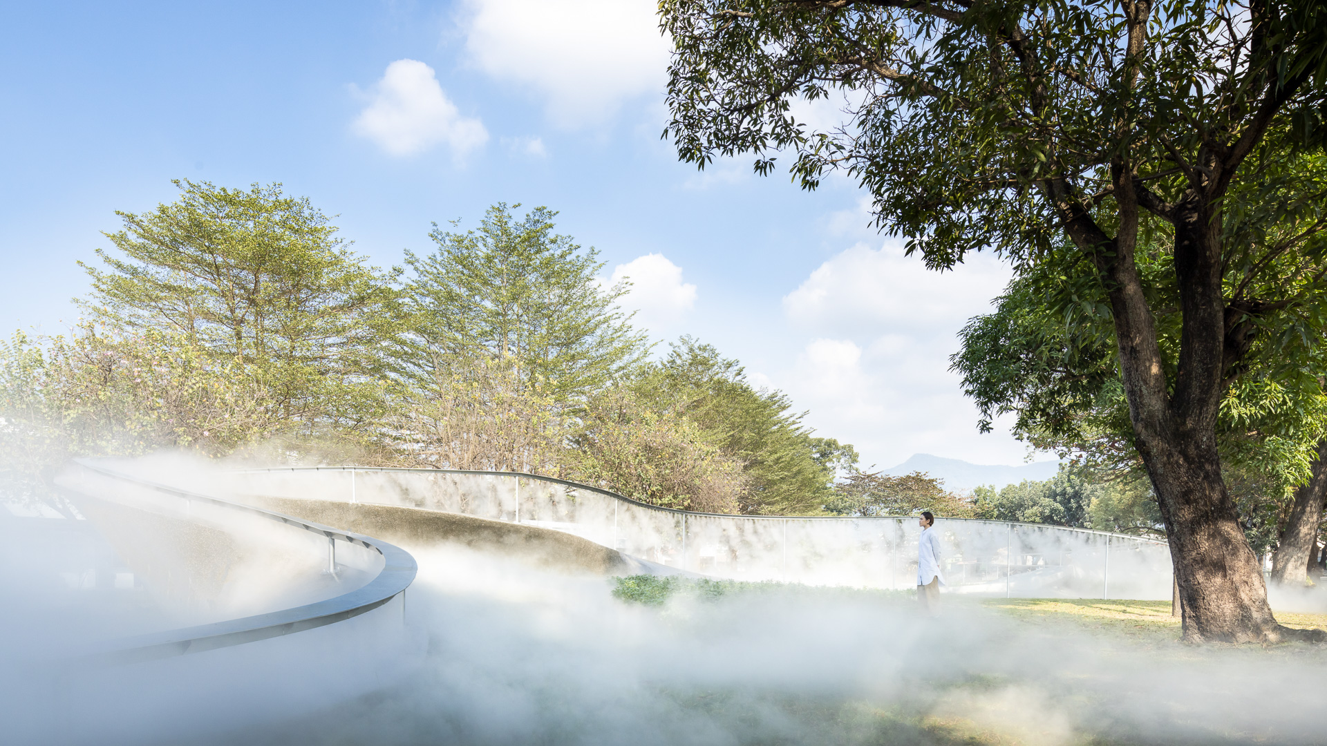 The elements of mist and glimmer resemble the collective memory of the region – at nights, the mountain mist flows along the ridges, creating radiances around the street lights afar. The natural mountain mist runs through the mahogany forest and pineapple fields. The recreated misty scene brings up the visual memories of gazing afar towards the mountain covered in mist and clouds.