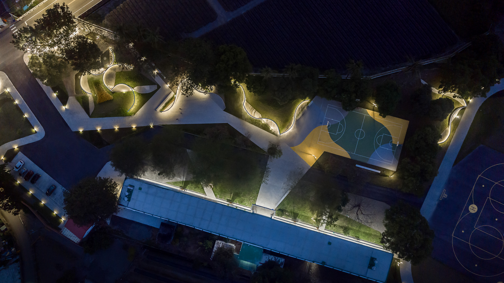 The reinvigorated campus celebrates the natural habitat of the region translating them into geometric forms in the landscape design. The continuous curvature of the concrete retaining walls echoes the patterns of the pineapple fields and the folds of the mountain ridges. The selected variety of plants in the campus offers an opportunity for the public to encounter bio-diversity, comprising of edible plants on the green hills and the restoration of aquatic plants in the eco pond.