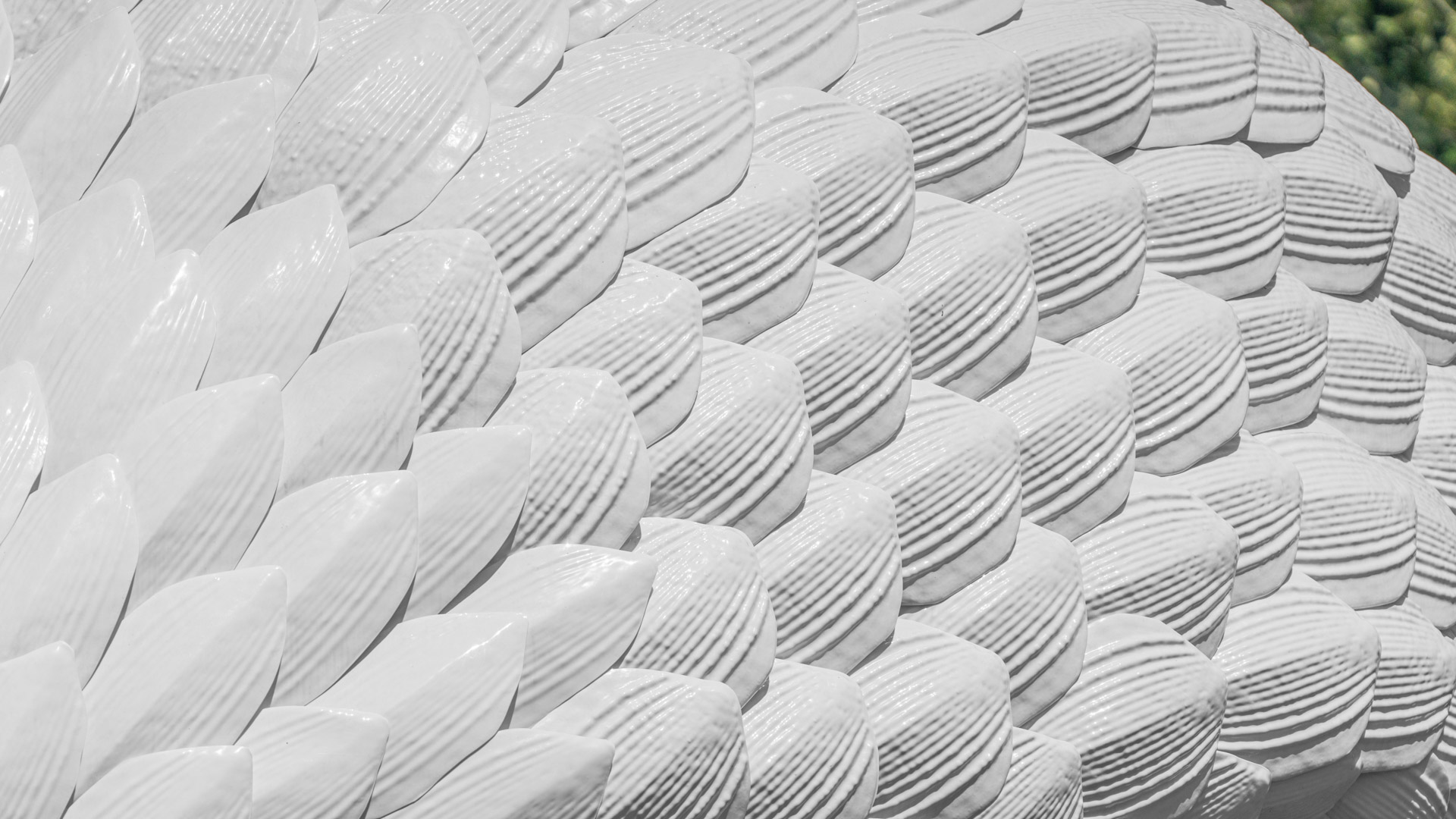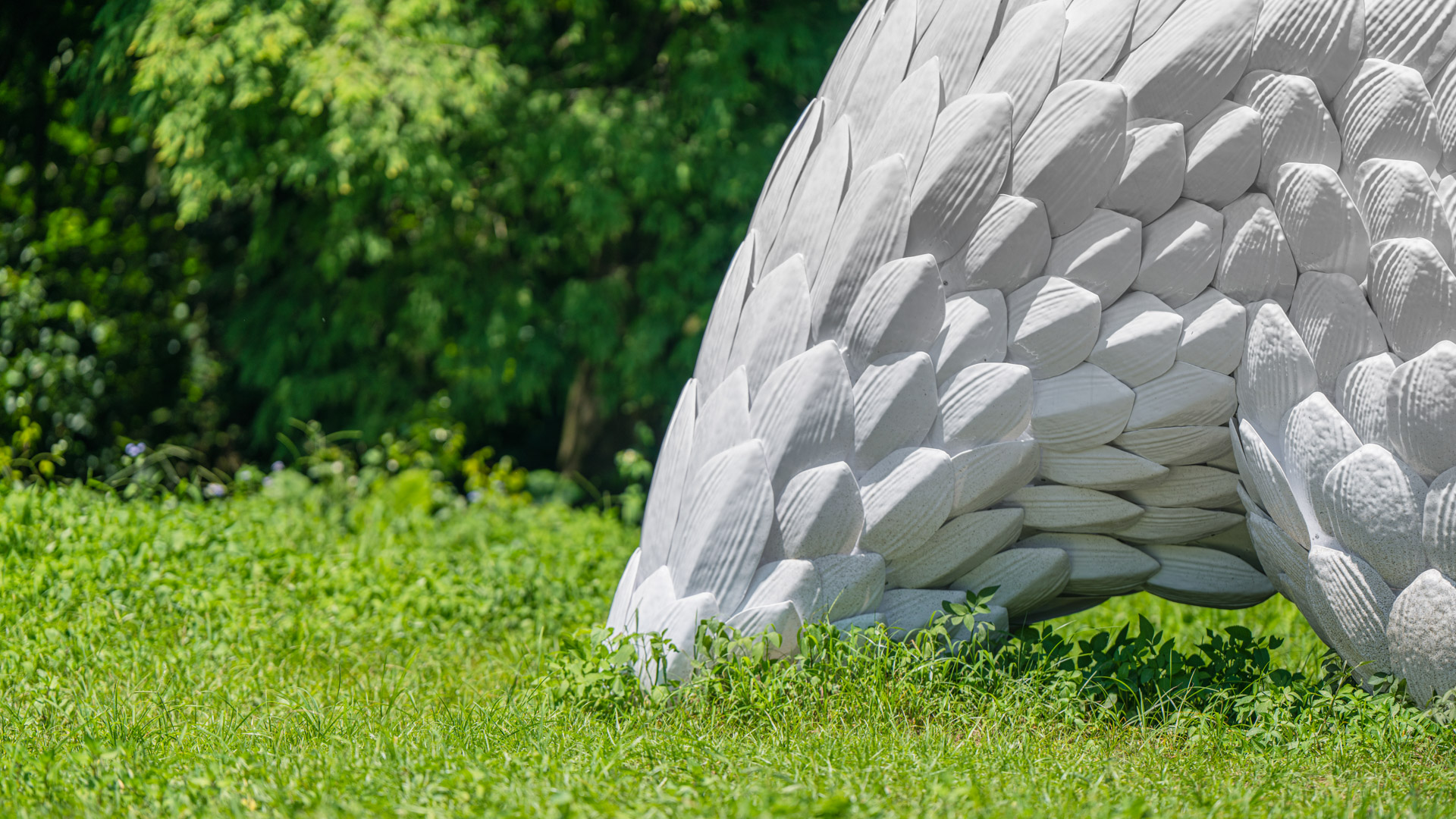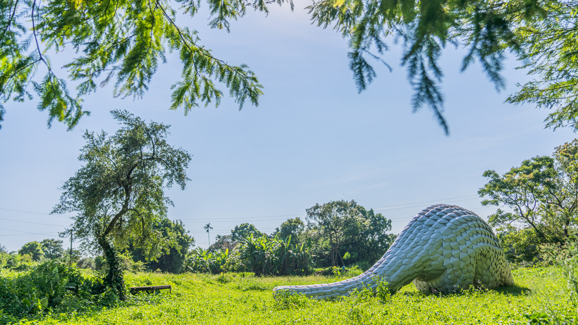 Under the theme of "Sleeping 'Ae:em", the artist Chen Hsiangfu created a giant pangolin with white scales lying asleep in the fallow land in Hengshan Mountain, Hsinchu, where wild pangolins are often found. Set against the scenery of larch forests and the Pek Kong (Earth God) Temple, this sculpture is intended to attract the public to linger during the art festival, and raise public awareness to the issue of conservation at the same time.