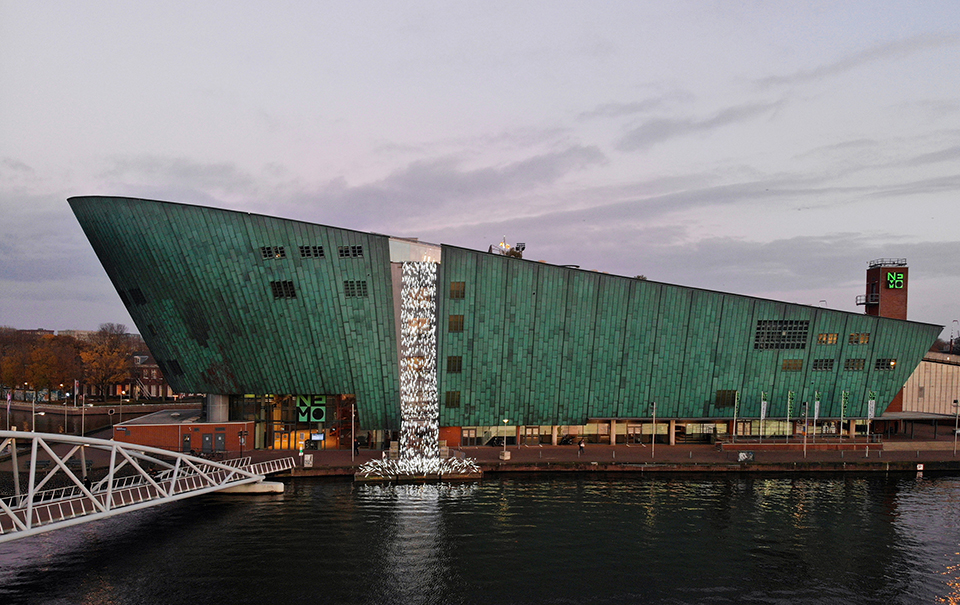 NEMO的外型猶如一艘巨船,作品巧妙地利用建築立面退縮的夾縫,嵌入作品的燈網與結構,運用懸吊的工法,將自然垂掛形成的弧面燈網分段設置,創造出館方要求的疏散動線與車道場域,同時彈性地建構出瀑布尾段與海上浮台銜接時所需的緩衝空間。「逆轉瀑布」從側邊觀看,就像數片巨大的紗簾垂掛在空中,但轉到正面時,片段的燈網就會共構出近十樓高的光瀑。