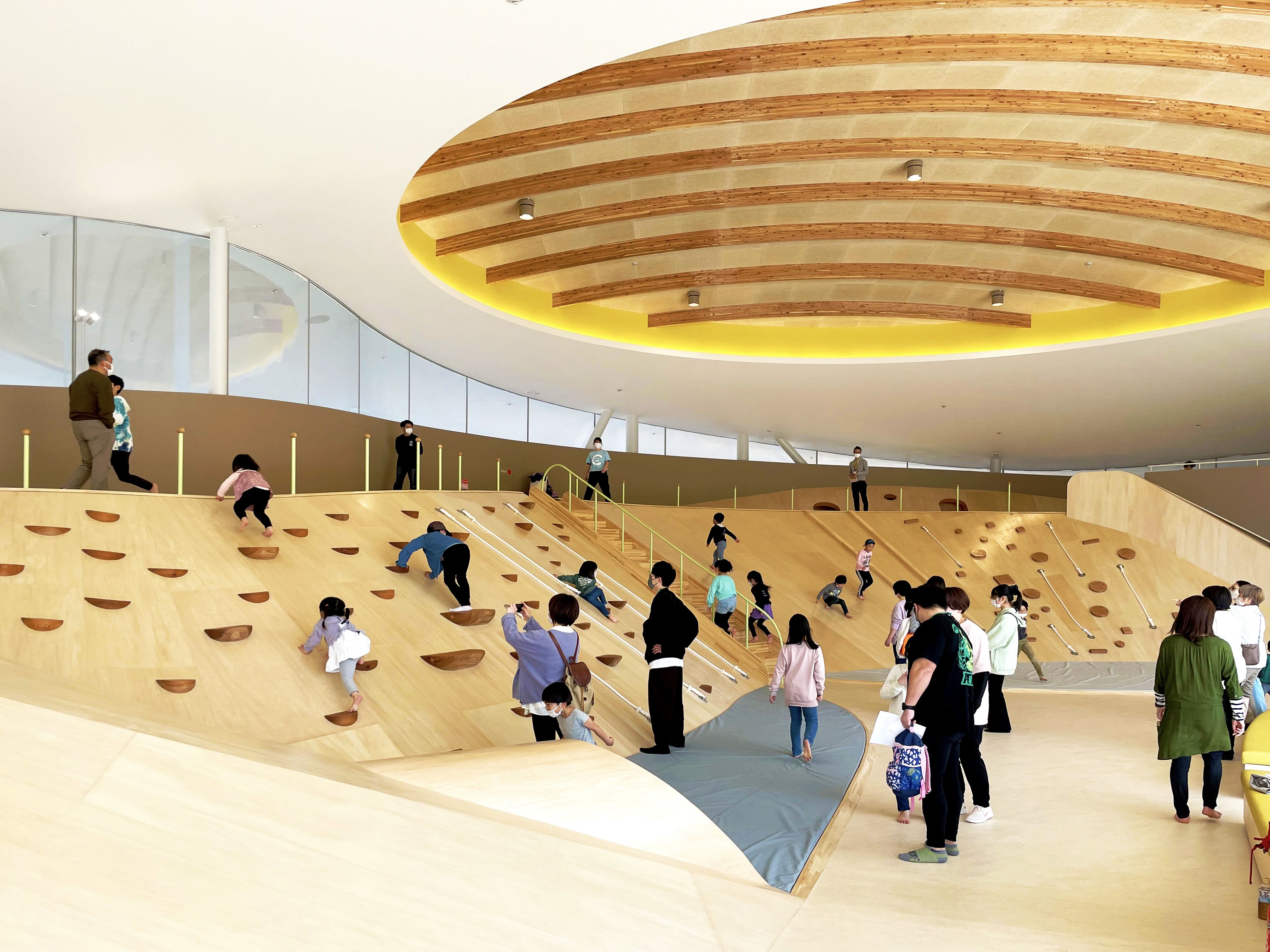 山形市南部兒童遊樂設施是一個不限行動能力、國籍、居住地,開放給所有小朋友的遊樂場所。作品基地選址在藏王連峰的附近,一個被山光環繞、鬱鬱蔥蔥、坐享優美田園風光的地方。由室內延伸至室外的緩坡融合周邊山形地景,為整體空間創造輕鬆活潑的氣氛,波浪形狀的屋頂也呼應著不遠處的連綿山峰,似乎在歡迎著所有人的到來。來到入口處,首先映入眼簾的是體育館最具代表性的木頭圓頂,館內也可以看到不同年齡層的大人與小朋友放鬆地遊憩娛樂。