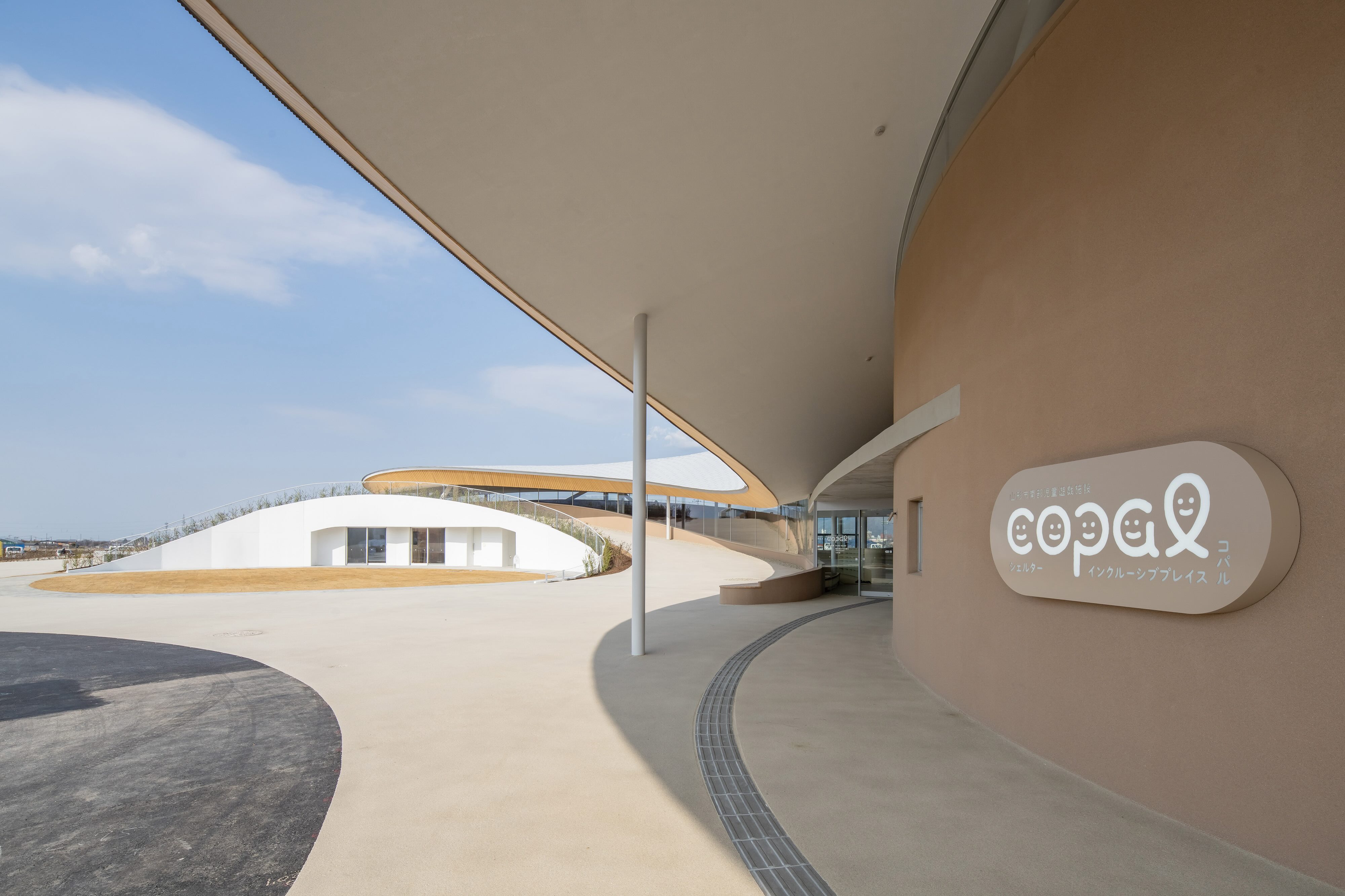 “Shelter Inclusive Place Copal” is a playground that is open to all children, regardless of disability, nationality, or home environment. The site is in a lush-natured area, with the Zao mountain range at proximity and the vast rural scenery that spreads out from its surroundings. The gradual undulations continue from inside to outside, creating a place that inspires a variety of playfulness in which all areas are integrated with the landscape. The softly undulating roof was designed to respond to the mountains in the background and at the same time to create a welcoming appearance that includes everyone. Upon entrance, visitors are greeted by the symbolic wooden dome of the gymnasium, where a wide range of children and adults exercise and play in the same space.