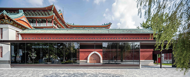 遺構史跡現地展示的敍事;建築瓦作、彩繪、拱門、紅牆、窗櫺等形制工藝的修復回返;開窗、露台、廻廊、屋頂平台等與當代都市日常及植物園荷花池四季時序的滲入;空間立體中軸與回應建築外觀的品字形空間,形成開放、流動以及與大樓梯的異質對話;博物館正面整合公共服務機能的平台,和親近身體尺度、水平並延展至建築內部天花的抽象棚架,以及層次進退隨不同視角與日夜間變化,時而映照當代都市,時而展露紅牆、拱門的玻璃牆面。共同形成博物館歷史建築的時間、空間的「退」。這樣的「退」,形同「策展」,讓歷史建築「文物化」,並因此涵容與對話當代日常及變化時序。因此,歷史與記憶是時空交織的共時辯証,是多重而身體性的感知經驗。