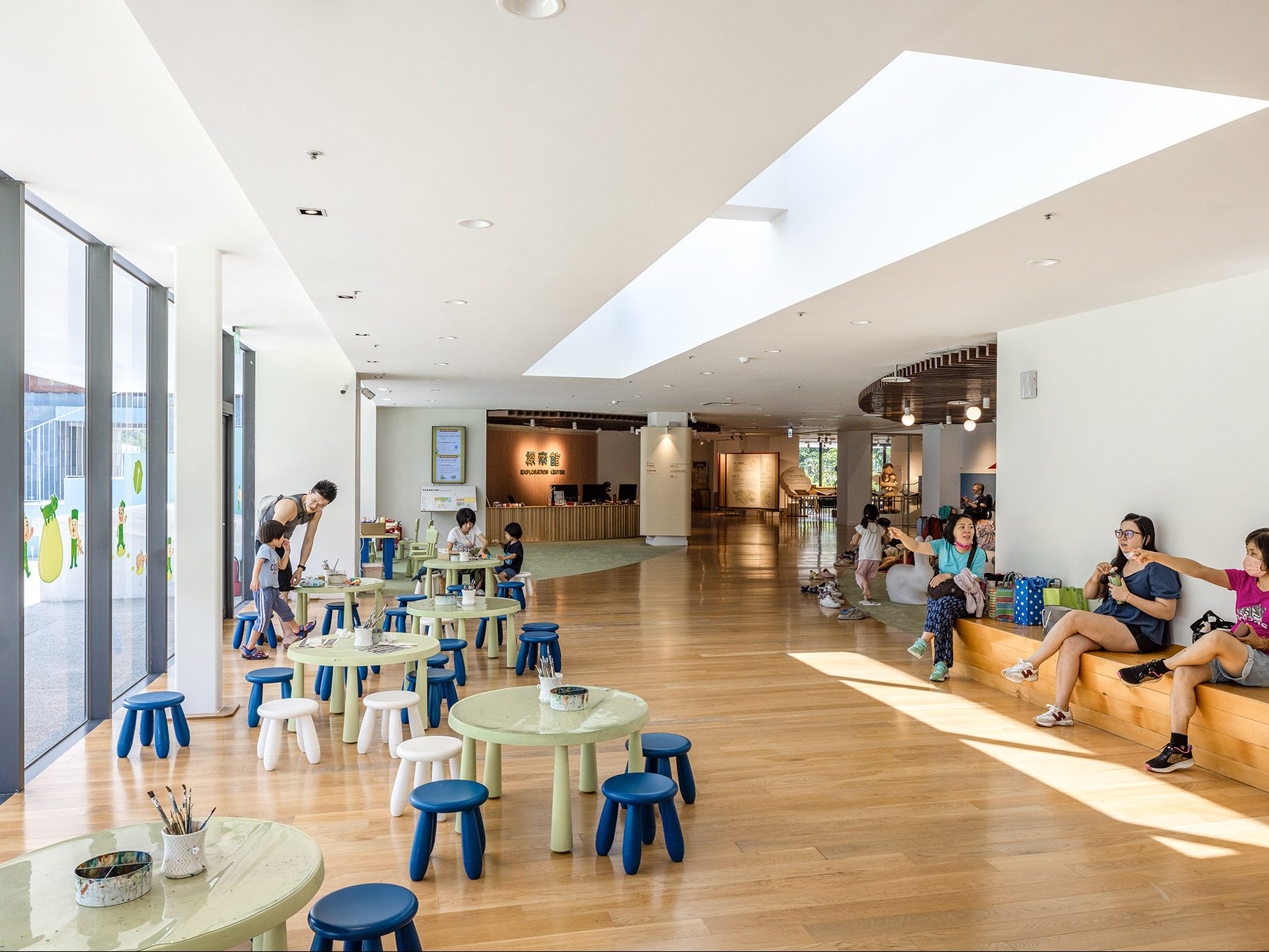 原本各自獨立的五個主空間「售票大廳」、「山之廣場」、「B1展示大廳」「教育空間」與「後方景觀花園」,各自獨立而缺少連結。我們打除了東側四座使用率低的藍色階梯看臺,增築樓板,做出串連的十二米通廊貫通全館,連結五個主要空間,作為設計主軸。
