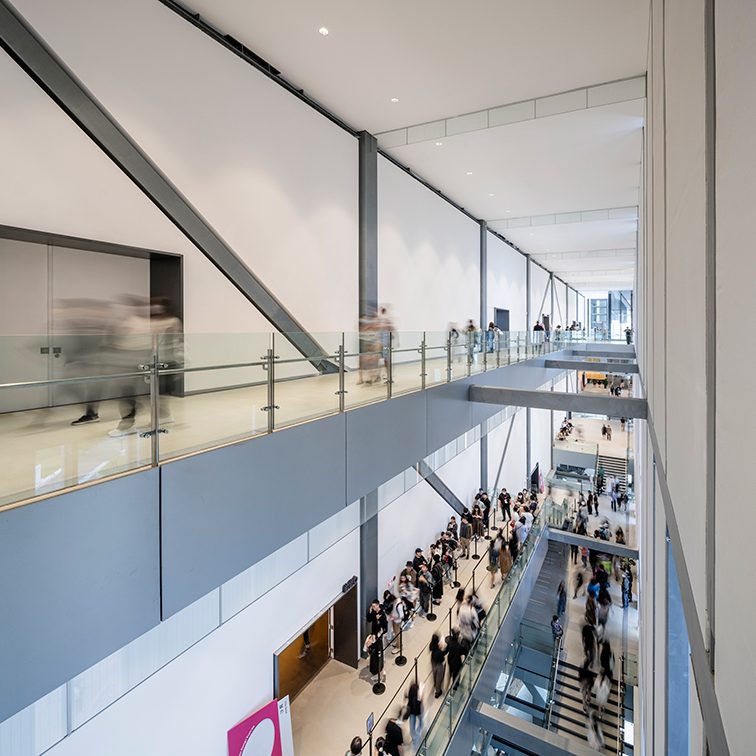 Above the village floats the steel-structured art museum, whose rigid rectangular mass disappears behind a swaying reedbed indicated by numerous vertical tubes of various heights. The long-span structural system ensures the most flexible exhibition space. A grand staircase leads visitors to the elevated lobby on the second floor, granting access to the four types of display spaces: general exhibition rooms, large-scale exhibition rooms, international exhibition rooms, and special-themed exhibition areas. A garden restaurant stands on the roof, where dining guests can enjoy an extensive view of the Da Han Riverscape. Another design feature is the individual circulation to the operation management center and collection storage that expedites control and security measures.