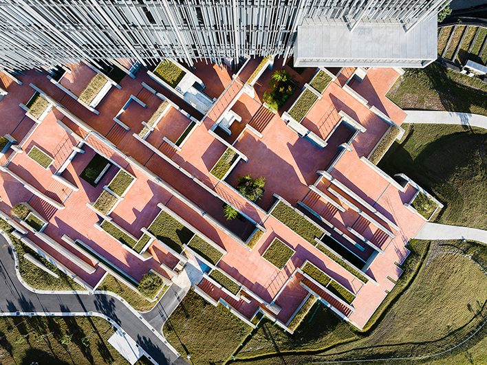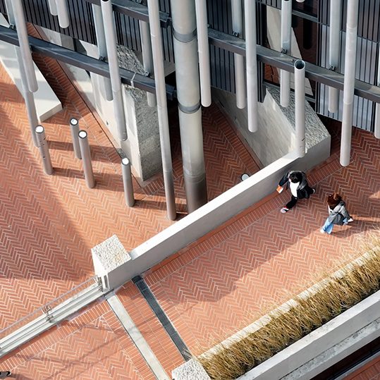 At ground level, the fair-faced concrete art village unfolds to reveal a network of art streets and sculpture terraces. This new museum follows the concept of a museum “open to all”. Visitors can freely wander around the outdoor terraces lined with cafes, workshops, and restaurants, spatially organized in the same manner as the old streets of Yingge and Sanxia. They can also participate in various art activities, linger to admire open installations, or follow the brick pavement to the hilltop and overlook the landscape.