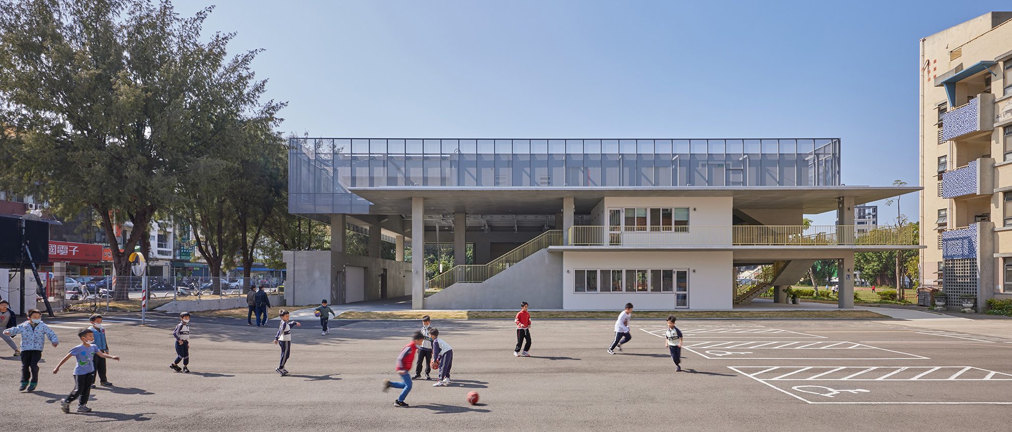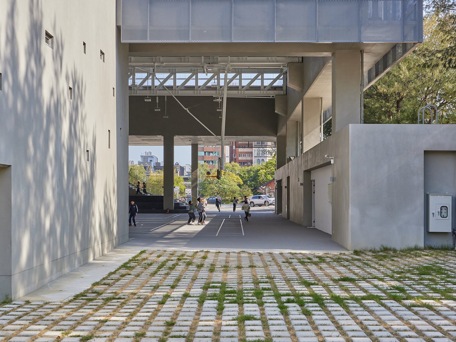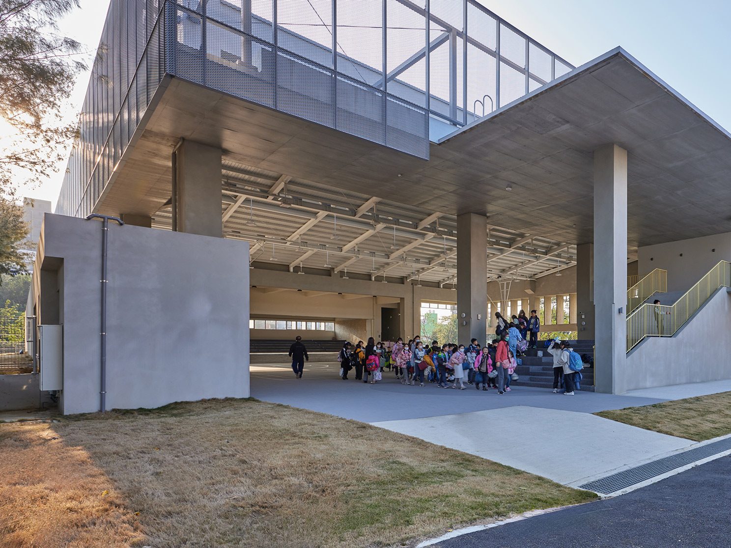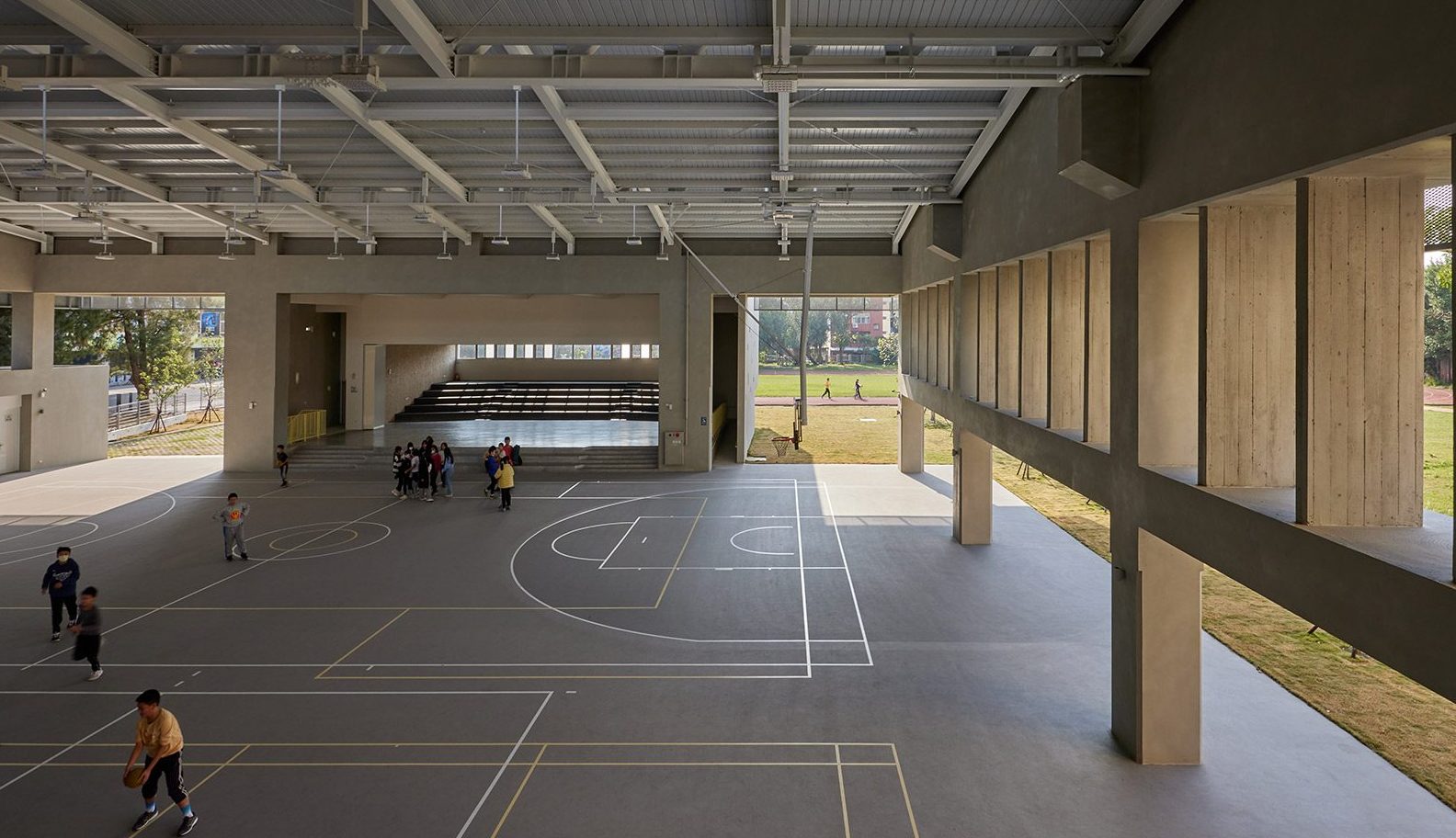 並非刻意營造體育場館氛圍,而是讓使用空間的人們能自然而然形成各種活動聚集,過往的體育場館還是會讓校園中的孩童會有種必須要通過申請才能使用的制式化空間,且有很明確的入口意象去指引人們進入,但我們反而是希望減少進入空間的指示,使建築與人的對話是輕鬆且寫意的。因此期許孩子即便是下課十分鐘短暫的時間內,也可以任意自由的使用多功能活動中心,即使一面牆或一根柱子,孩子也能形成遊樂的場域。藉由淡化球場的氛圍感,讓即使是短暫通過空間的行人,也能感受到建築與環境的共融,帶來通透、自在的體感。