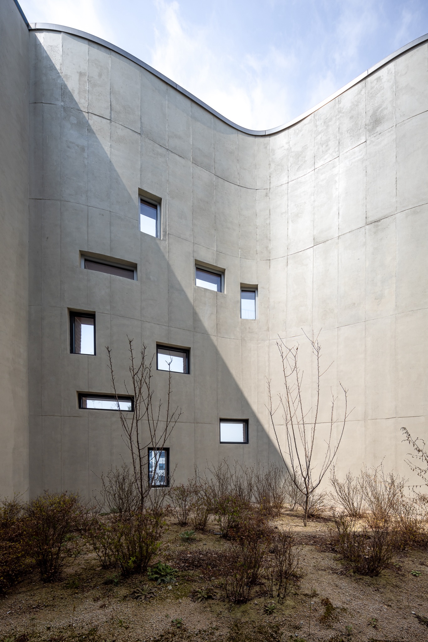 The waving façade acts as a backcloth for the urban perspectives of the streets that lead into Seongsu-dong District from the west across the Seoul Forest Park. This characteristic solid façade houses the service program and the vertical circulations, while the outdoor gardens and terraces on the east façade offer a wide-open view towards the Han River and Seongsu-dong District. The north façade is composed by apparently random openings categorized by three different types that respond to programmatic requirements of the space.