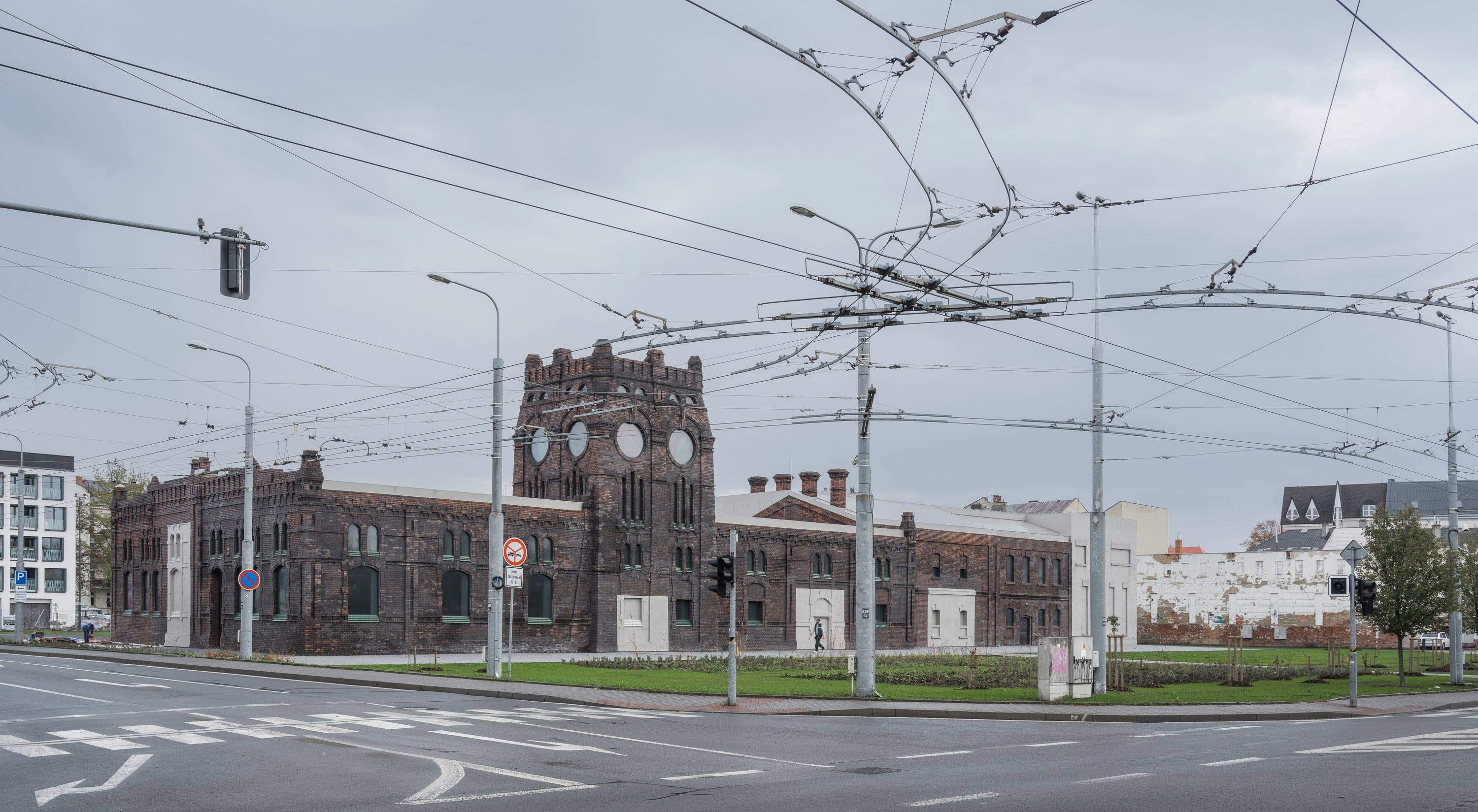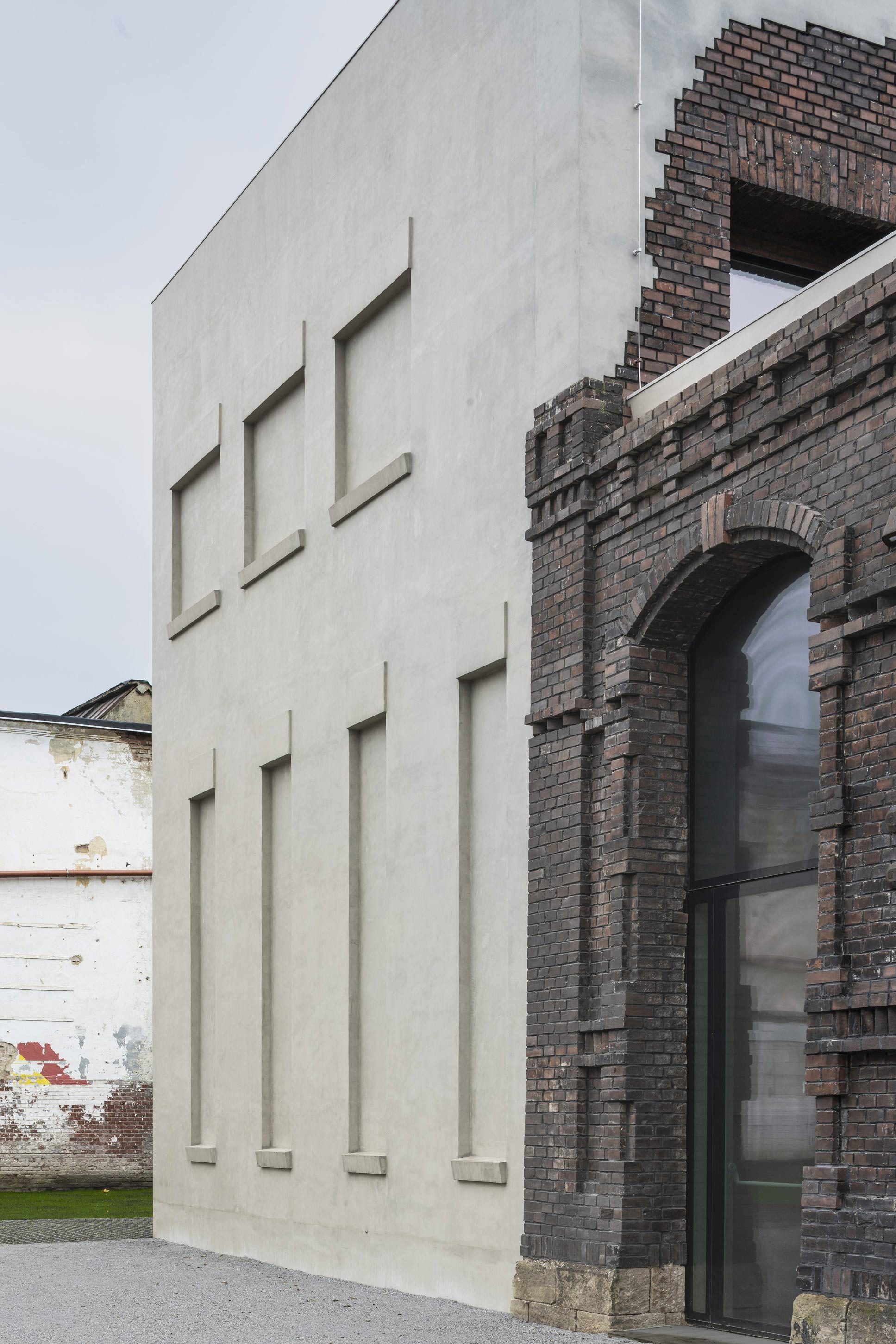 The realisation is the result of an international competition to transform a dilapidated old slaughterhouse in the Czech city of Ostrava into the PLATO Contemporary Art Gallery. The walls of the slaughterhouse were dilapidated and battered in many places by huge holes. The soot-reddened brickwork bore witness to the city's industrial history. We took these deficiencies at face value and added another layer to the history of the building, which is under conservation protection. We were allowed to preserve the character of the soiled brick and the windows, and to fill in the openings in the walls with contemporary material while retaining the old ornamentation of the brick walls. We also used the adopted principle of recreating all non-existent elements of the building from micro-concrete to rebuild the collapsed section of the slaughterhouse.