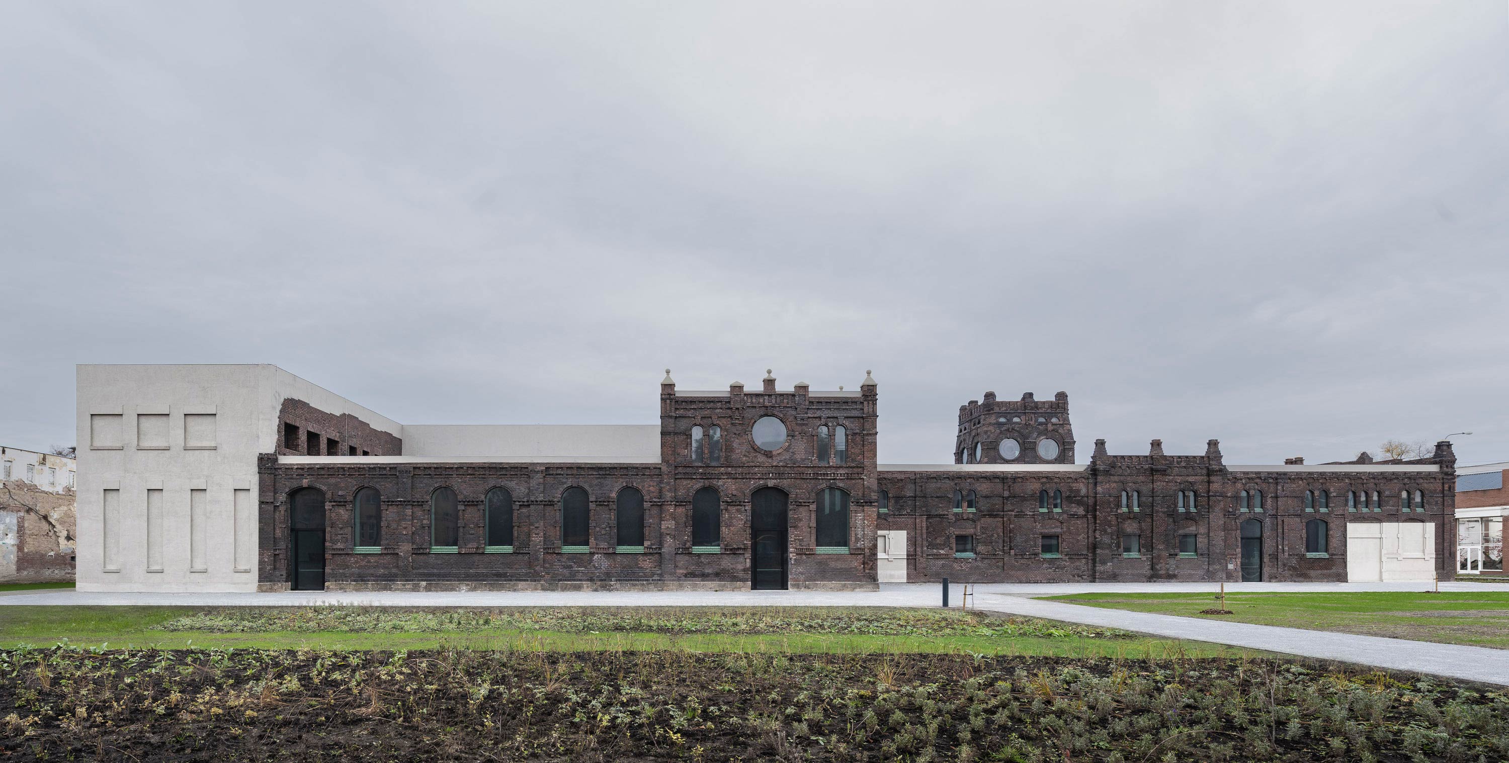 We were involved not only in saving the former slaughterhouse building, but also in the design of the outdoor areas even though this was not our task. We convinced the authorities to abandon the concrete paving. The contaminated soil there was rehabilitated and replaced by a biodiverse park with water-permeable floors, flower meadows and with retention basins. The layout of the greenery refers to the location of the buildings that once supported the slaughterhouse, and edible crops, also inside the gallery, complete the transformation of the site. The result is an inclusive space that sensitises not only to art but also to environmental issues.