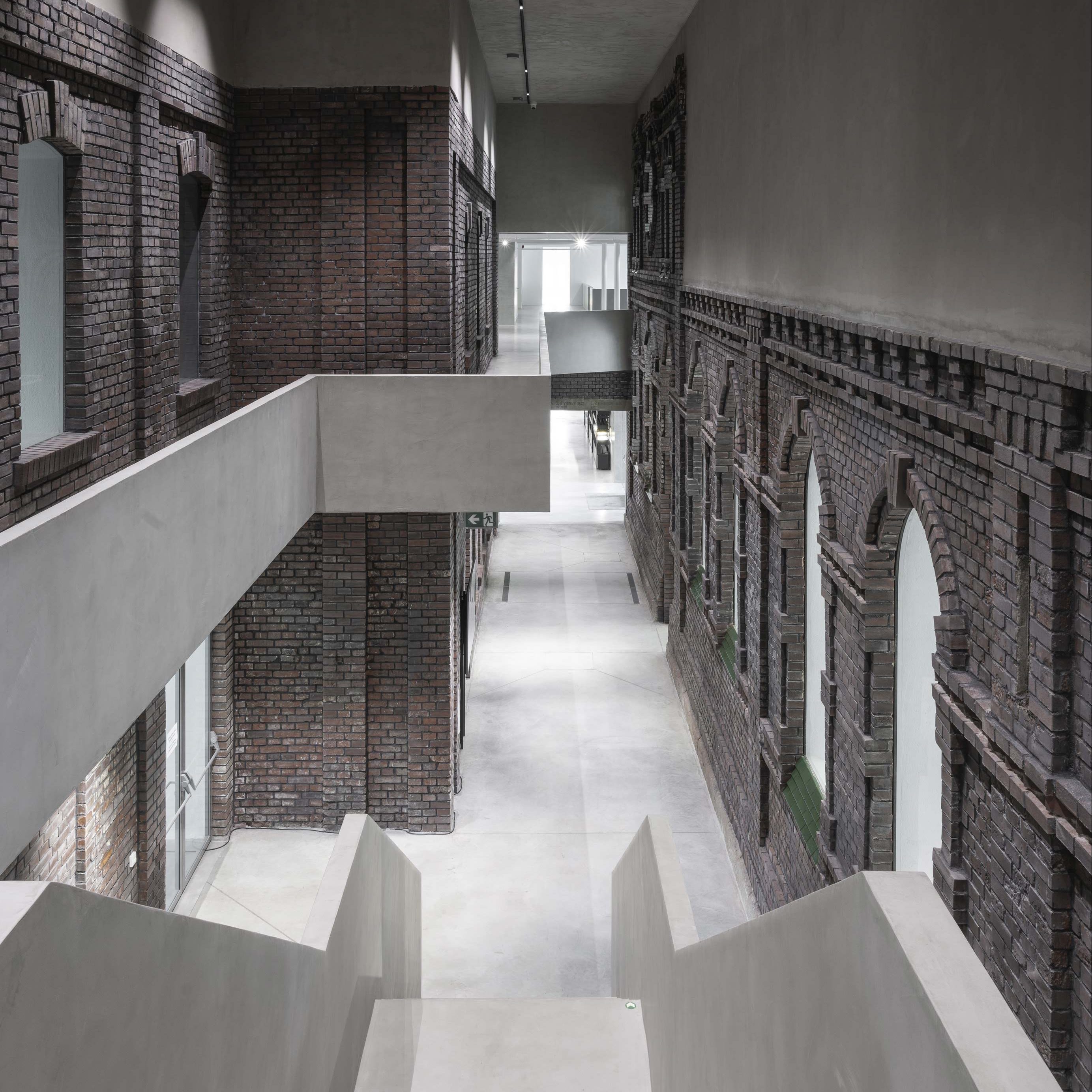 The original dominant material of the building is brick. The destroyed bricks have been mostly replenished with those salvaged from a collapsed section of the building. The new glazing has a ceramic screen print, making it appear dark and dull, attenuating the light in the galleries.