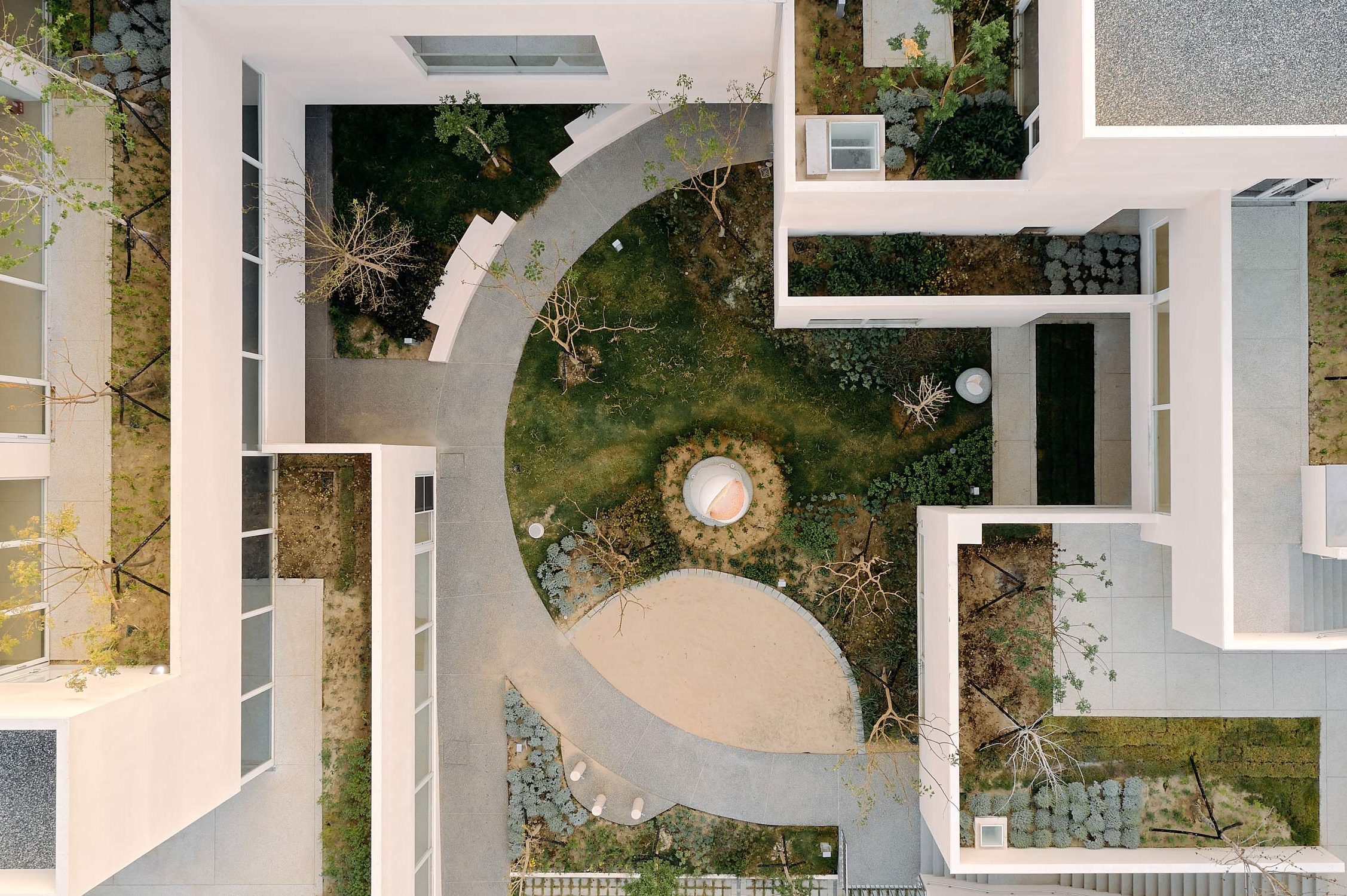 The courtyards also act as local ecological habitats inviting birds and butterfly to settle, creating ecological patterns and cycles of life in all directions. These provide children with opportunities to watch and learn. Along with the various natural surroundings, there are also paved open spaces that support the diverse and rich social activities