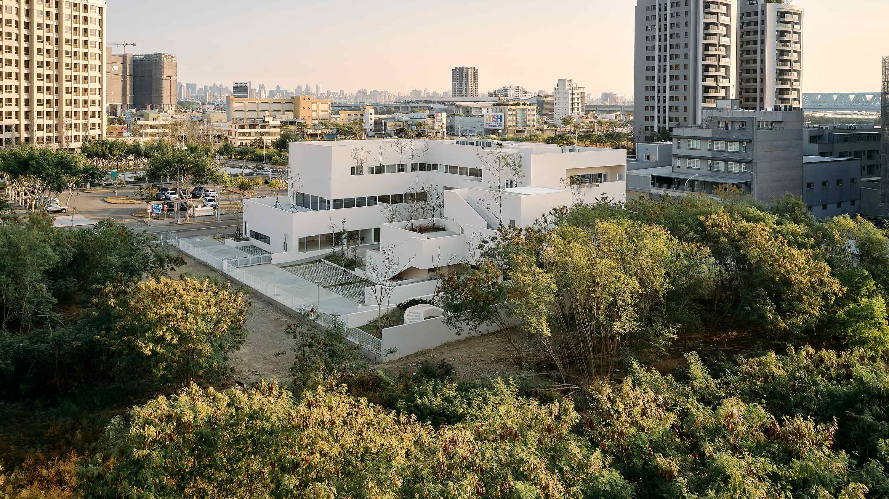 而建築則落在自然與樹蔭的縫隙間,分東、南、北三棟,並以景窗迴廊圍繞著各向大小院子的自然光庭成ㄇ型配置,並以退台方式面對大小內院,創造複層的自然活動地景,讓各層之功能空間皆有延伸的戶外空間,提供兒童在充滿自然與光的活動環境中探索學習。東棟晨日區為主要服務空間、南棟林邊區,臨北面中庭大院子與南向日照區,配置公托及五感探索之多樣活動空間。北棟臨城市公園,配置社區舞台、親子廚房、新住民及婦幼多元文化展演及交流空間,以在自然中的社福活動成為都市的景窗;西側銜接中庭為打開的大院子,讓自然成為空間的核心,建築為親子活動、體驗探索自然生態光景的背景,留給城市與社區一處寧靜自然的成長場所。