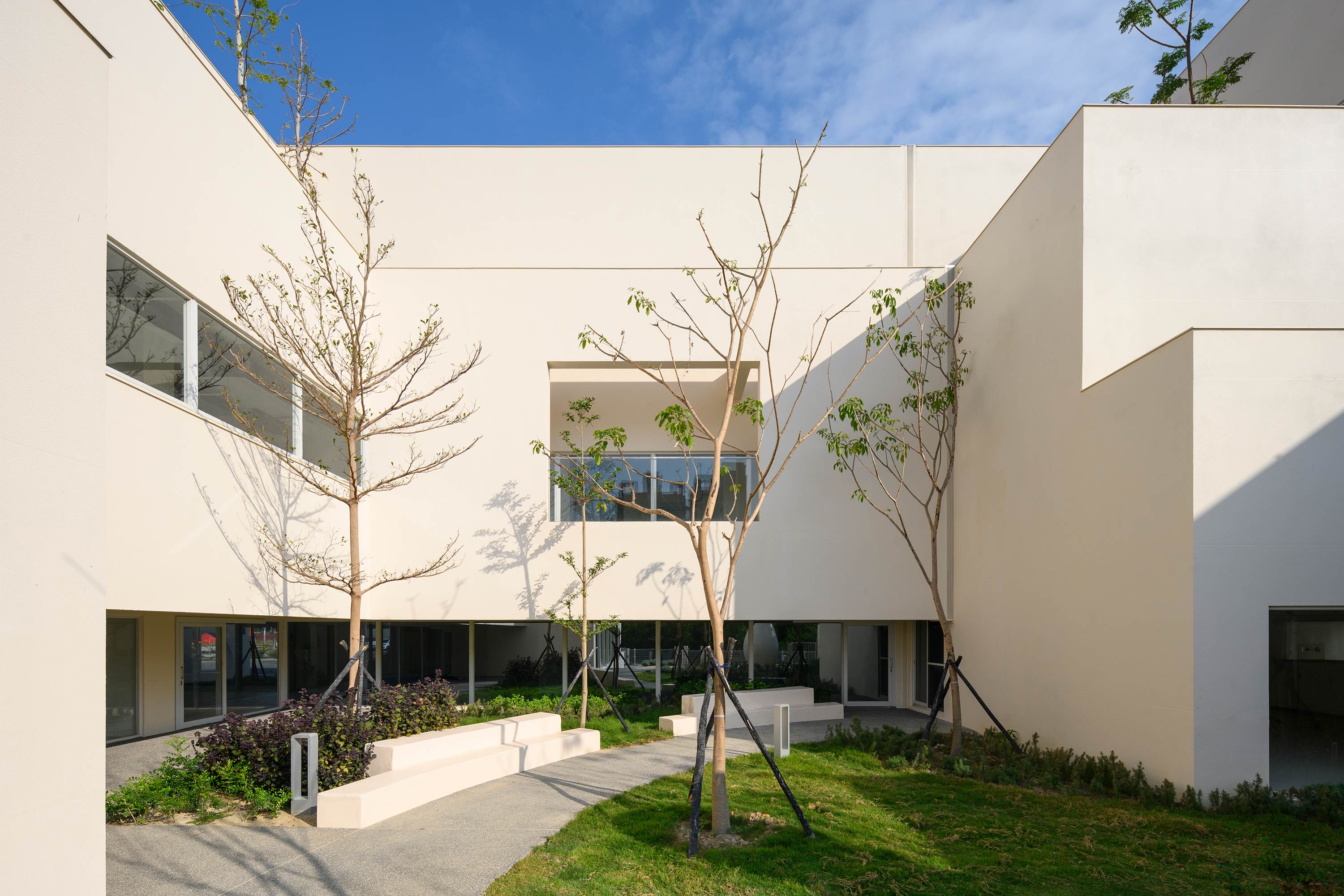 The Centre is situated in the crevice between nature and the tree shades. It is divided into three buildings: the east wing, the south hall, and the north complex. The buildings are arranged in U-shaped courtyards with wrap around corridors filled with natural light. The courtyards are of various sizes with immense setbacks creating multi-layered natural activity spaces. The setback corridors allow the interior activities on each floor to extend outdoors, providing children with opportunities to explore and learn in the environment full of nature and light. The east wing bathed in morning sunshine accommodates the main service spaces. The south hall is adjacent to the woods, the botanic gardens and a large atrium courtyard. Various activity spaces for public care and exploration of the five senses are deployed here. The north complex faces the city park and accommodates a performance stage, an experimental kitchen, and a multicultural communal space for citizen. It allows for various social and educational activities to occur in nature, acting as an ‘urban window’ to the city. An exterior natural atrium on the west side is connected to a large open courtyard introducing sun light, announcing nature as the center of place. The Wuri Welfare Center is the foundation for parent-child activities / experiences and the place for exploring natural ecological scenery. It gives the city and the community a quietly natural place for growth.