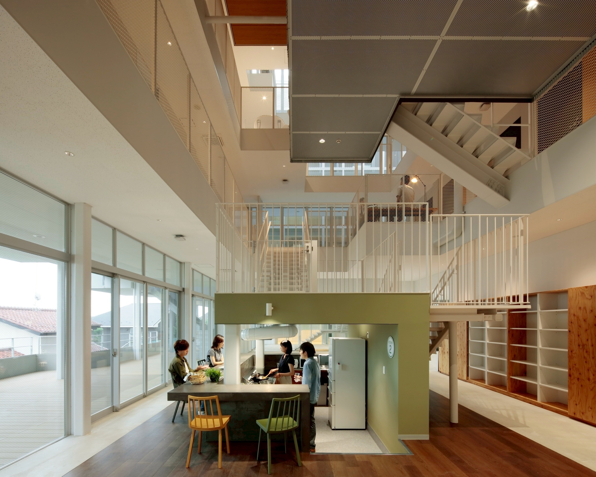 It started from a proposal for a competition of a dormitory for 200 international students to live together that required “Realization of new community space through living together”. We thought that not only cultures and customs, such as language and dietary, but also diverse backgrounds including personal preferences of each students could become a trigger for communication. We created a space like a small living room which we named “pot” and arranged them in three dimensions inside the huge 4-story atrium. The “pot” is a dwelling scale of 10-meter square footage, each having different shape with different furnitures and finishings. We expect spontaneous encounter inside the common space with various place to stay, where the students spend most of their times. It is a “International dormitory like a city” , where communication between students are not just a routine but fluid and casual.