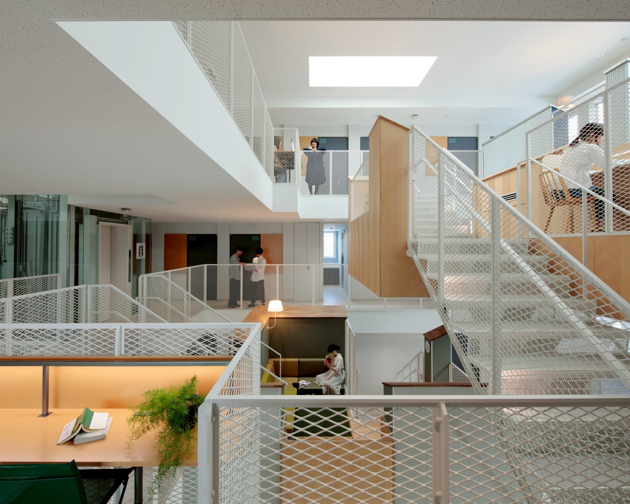 因此,我們創造出一種小型客廳般的空間,命名為「pot」,並將這些「pot」立體地分布於巨大的四層樓中庭內。
