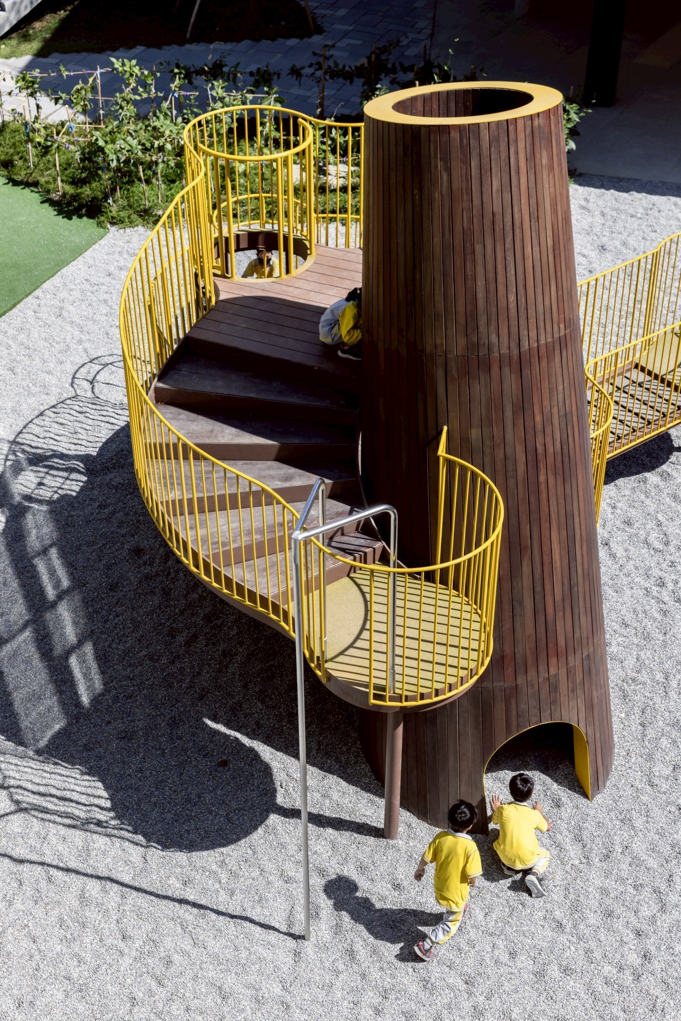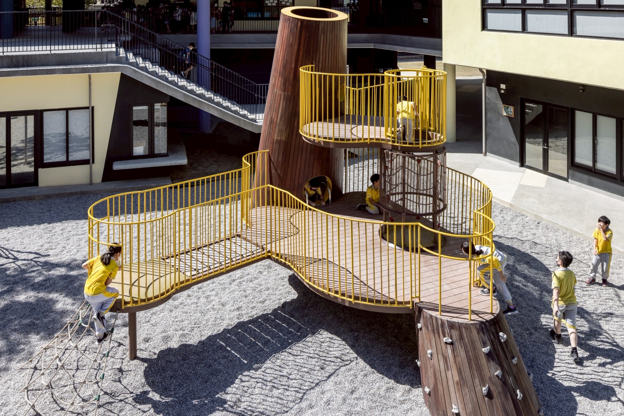 The schoolchildren navigate through the wobbly suspension bridge as if crossing a stream. They slide rapidly down the pole as if playing on vines. The accompanying handrails resemble clouds and mist scudding across the volume. The schoolchildren can go into hiding in the caves and peep out at the sky, as well as crawl amidst the soft climbing net and the hard climbing block…