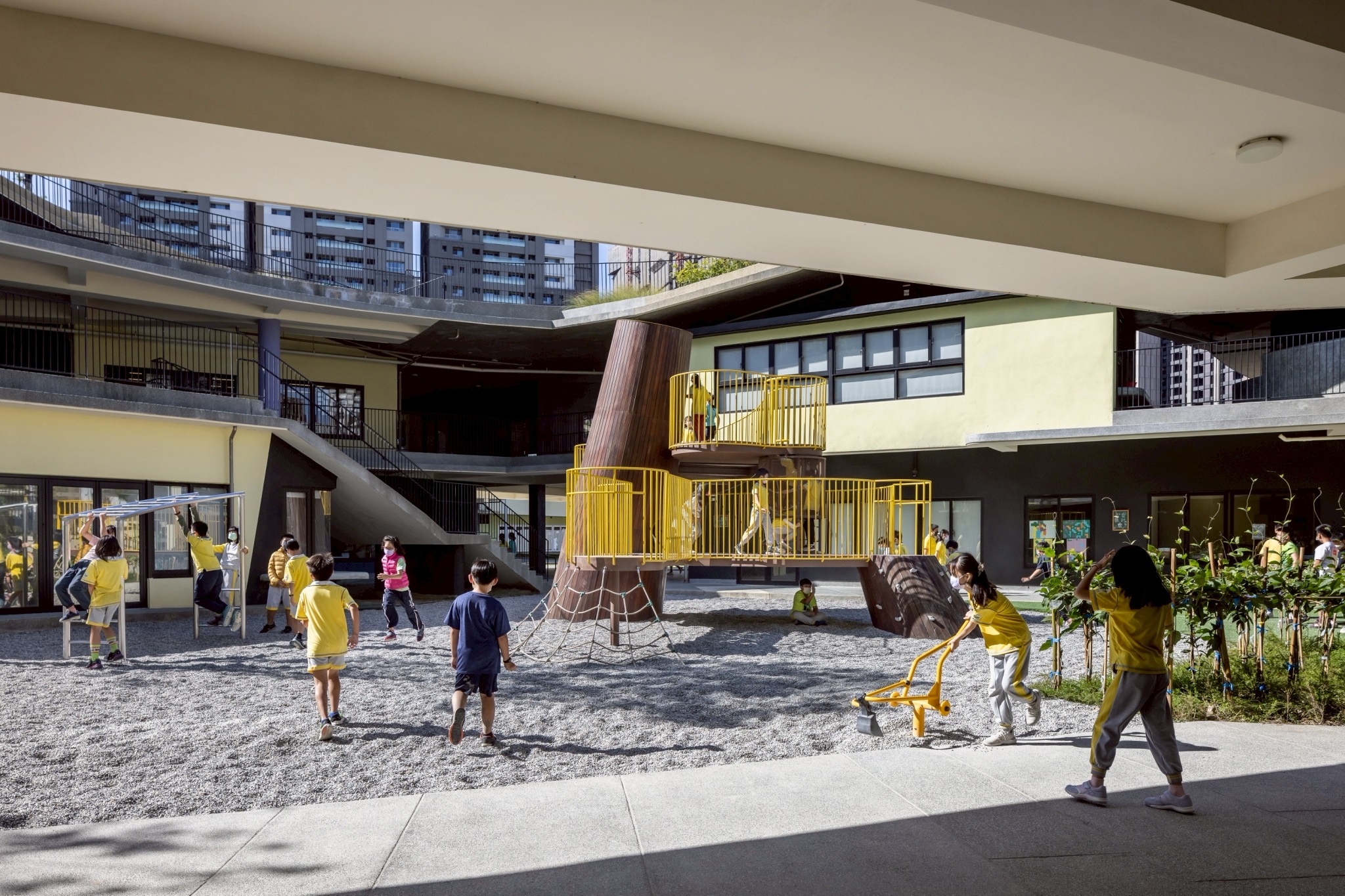 To blend the playground harmoniously with the architecture, we employ the colors of woods and sunshine as the overall tone and use Selangan Batu as the exterior panel material that renders the tactile quality of the surface for climbing closer to nature. Gravel paving material offers the schoolchildren a novel tactile walking experience. It also acts as a cushion, absorbing the impact of a fall while climbing. When they run around in the playground, the gravel material also becomes part of their games. The gravel paving is encircled by a large lawn, a buffer zone for children to have a rest or a close observation.