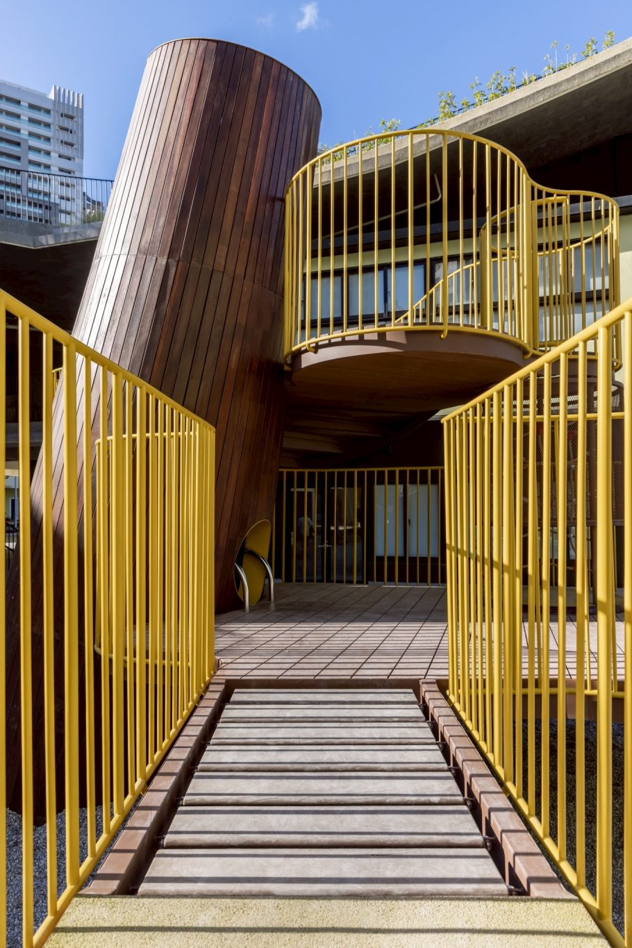 在結構平面規劃上,兩側的環形框架柱能夠形成有如大柱一般的存在,有效輔助建築結構的穩定性,同時減少落柱需求,使下方空間的活動動線能夠更為順暢供孩子玩耍。